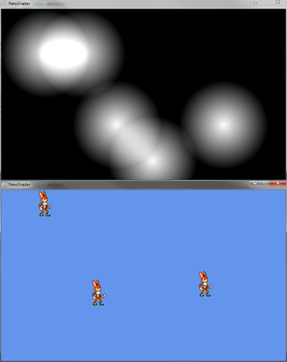 With those hurdles out of the way I can begin describing exactly how this all works. If you look back at the Draw method you can see I’ve broken the method into three main sections. We have a render target drawing the light mask and a render target drawing our main scene. If I were to Draw each of these targets separately you’d see the following respectively:
