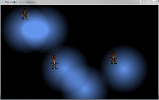 The other new feature I’ve introduced, specifically in the lighting render target, is the use of AdditiveBlending with our sprite batch call. This will allow us to draw our light gradient multiple times in overlapping areas adding to the effect where multiple partially white areas overlap. You can see the effect demonstrated below as I add more and more light sources: